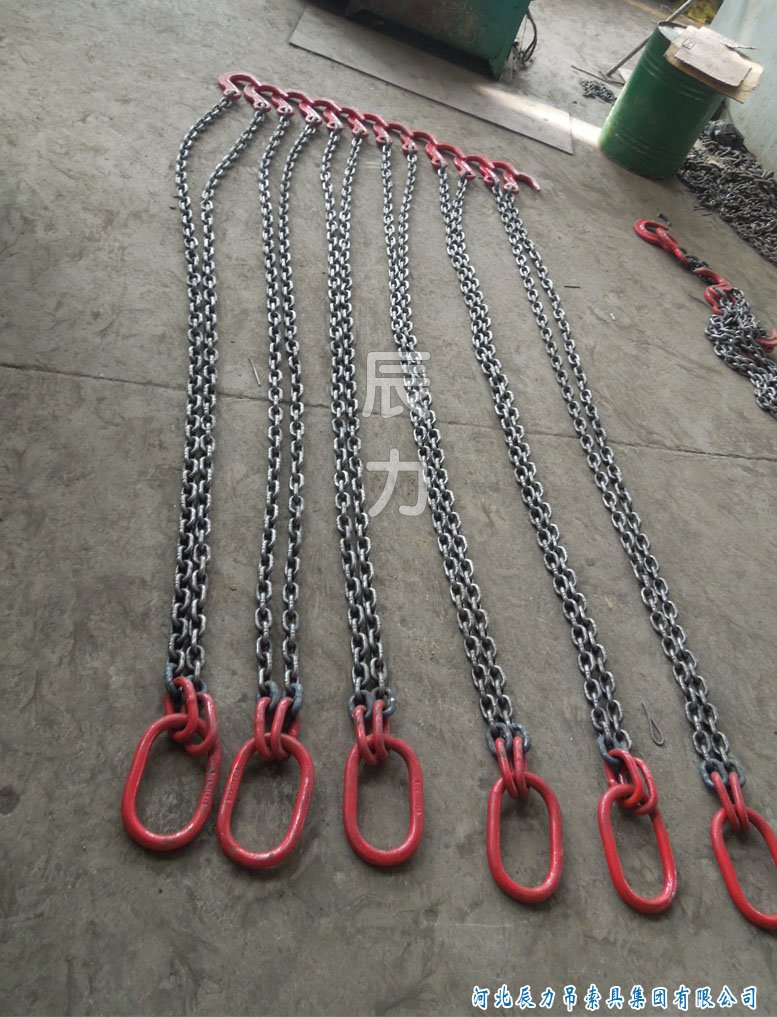 辰力公司可按照客戶的需求生產帶連接環的雙腿起重鏈條索具。如上圖為13mm的連接環與10mm鏈條相連接,這樣可大大減小鏈條索具的成本。